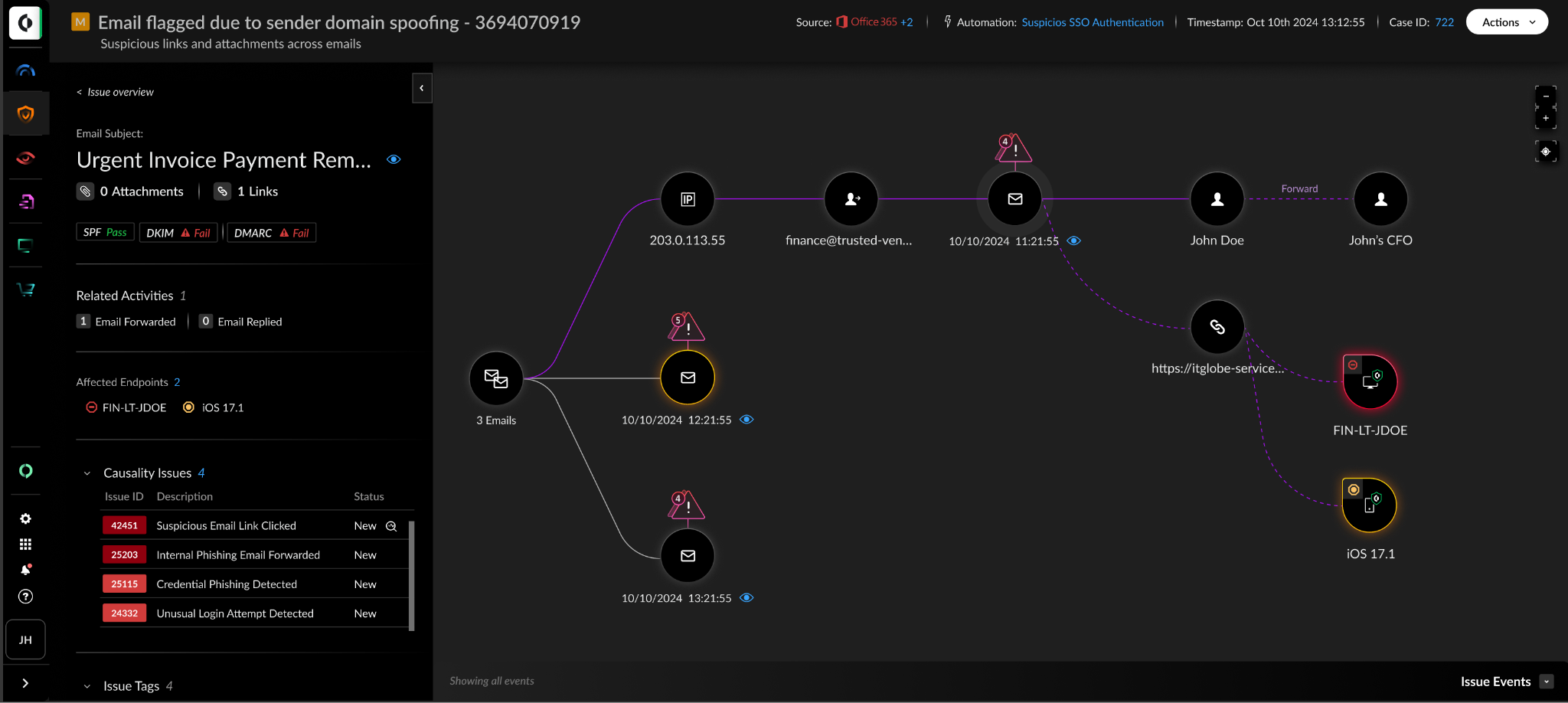 通过关联来自电子邮件、身份识别、端点和网络的丰富数据,进行全面的攻击路径分析,从而缩短检测和响应时间。
