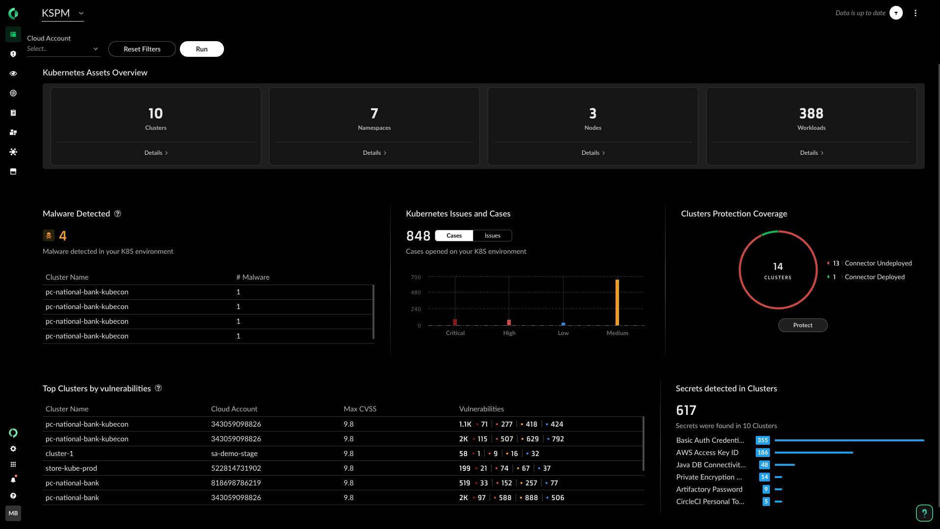 利用指导修复功能查找并修复 Kubernetes 配置错误和安全风险。针对 EKS、AKS 和 GKE Kubernetes 集群,加强 Kubernetes 态势并符合 CIS 基准。