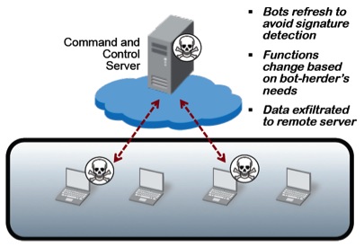 僵尸网络(又称“机器人网络”)是一个由感染了恶意软件的计算机组成的网络,这些计算机由被称为“僵尸操控者”的单一攻击方控制。在僵尸操控者控制下的每台机器都被称为一个僵尸。攻击方可以从一个中心点指挥其僵尸网络中的每台计算机同时开展协调的犯罪行动。僵尸网络的规模(很多由数百万个僵尸组成)使攻击者能够执行大规模行动,而这在以前的恶意软件中是不可能实现的。由于僵尸网络始终处于远程攻击者的控制之下,受感染的机器可以接收更新并即时改变其行为。因此,僵尸操控者往往能够在黑市上出租其僵尸网络的部分访问权限,获得可观的经济收益。